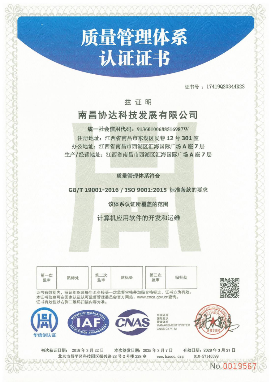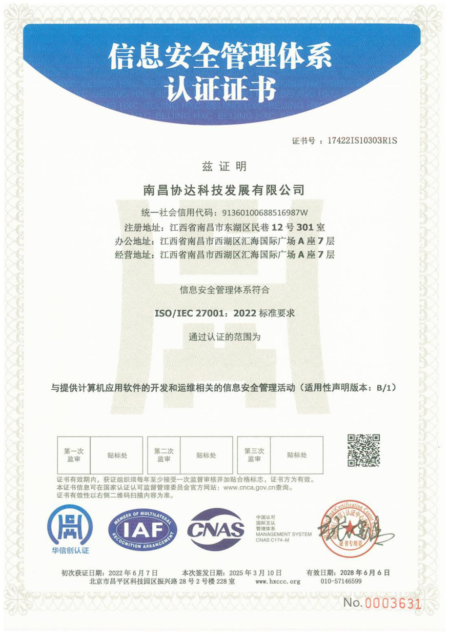 協(xié)達(dá)科技成立于2009年5月,憑借高端的軟件研發(fā)技術(shù)及先進(jìn)的管理理念順利通過保密資質(zhì)、國家高新技術(shù)企業(yè)資質(zhì)認(rèn)定及江西省“專精特新”中小企業(yè)資質(zhì)認(rèn)定,先后獲得CMMI3級證書、ITSS運(yùn)維服務(wù)、CCRC軟件安全開發(fā)、ISO27017、ISO27001及三體系認(rèn)證證書等。